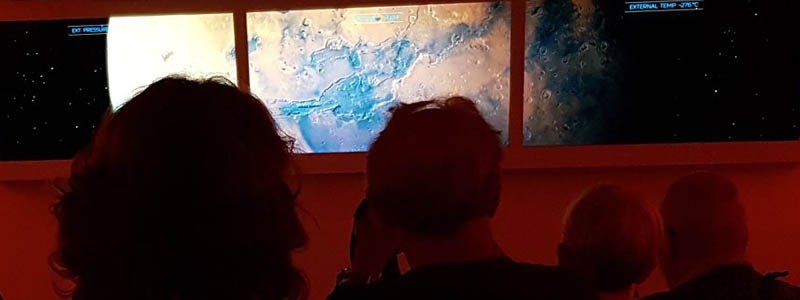 The exhibition, consisted of 23 HD screens, throughout the site, some projection, some flatscreens. All linked and synced to a master computer driving the triggering of each screen. The final destination, the planet Mars, was a 18m x 6m wide projection mapped and blended around a 9m geodesic dome. The projections simulated the experience of a huge duststorm on the hostile planet.